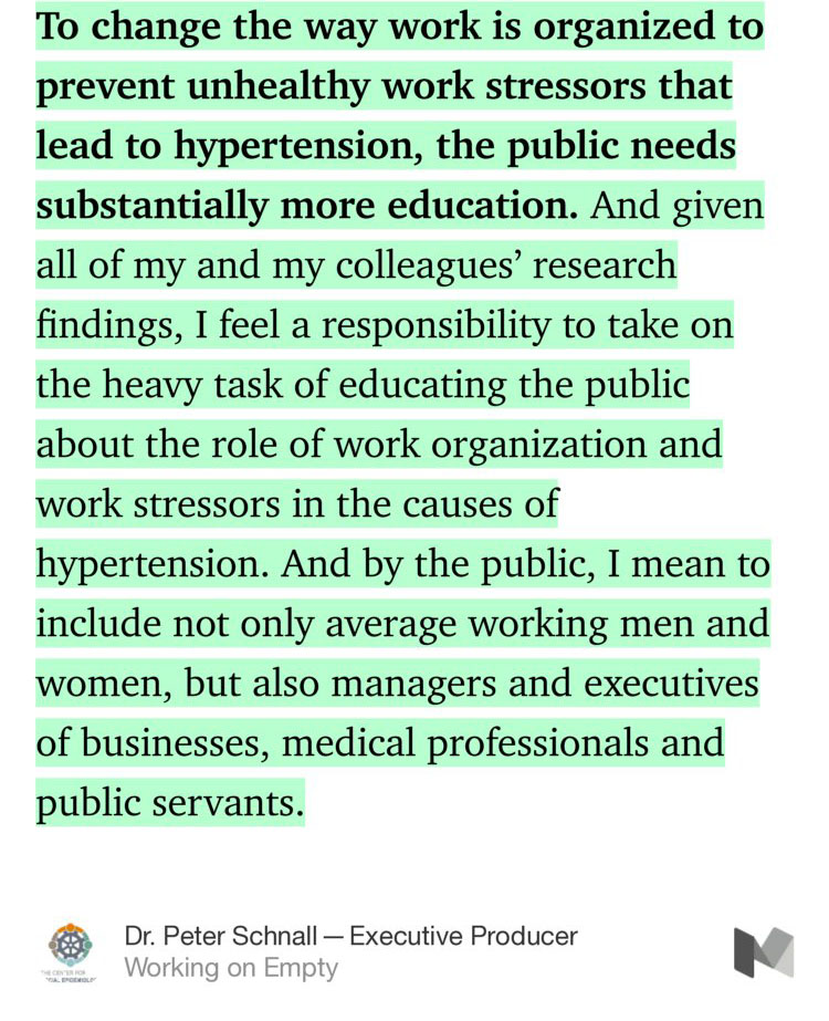 “We are interested in documenting stories about unhealthy work conditions, such as: job strain (high demands w/low control), high stress workplaces, excessive overtime, unsupportive managers, unfair wage disputes, lack of benefits (no paid sick leave or vacation time), job insecurity, freelance or temporary contracts, unsafe workplaces, etc.”